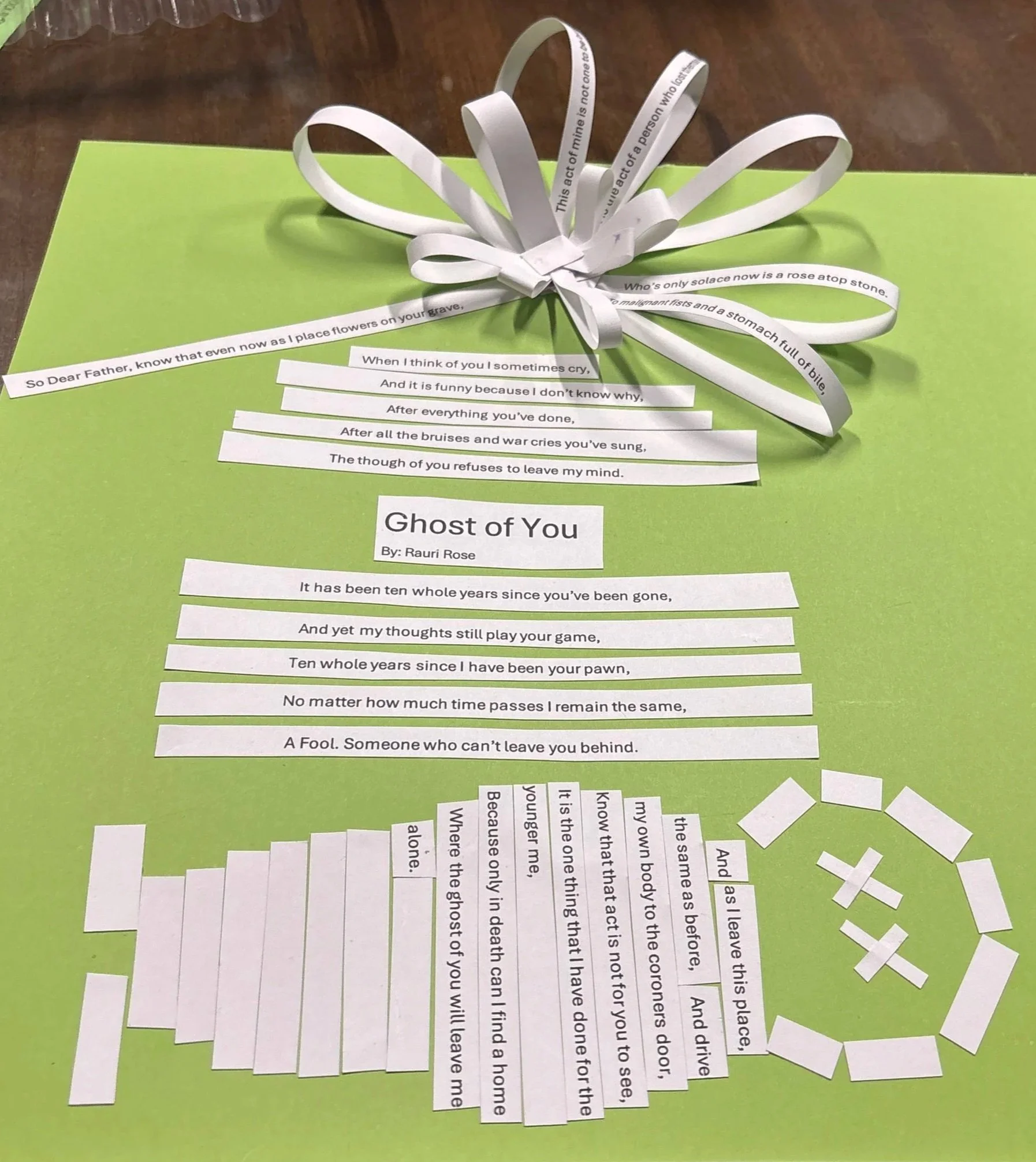 The photo depicts a poem cut up into the shape of a flower, a grave, and a corpse. The flower is on top of the gravestone and the corpse is beneath it.
